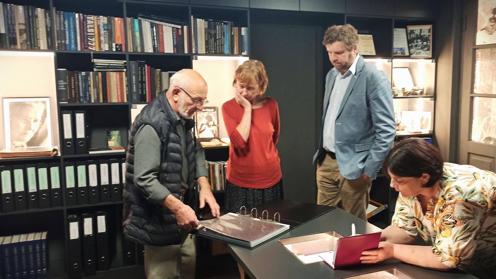 Igors Pličs sarunā ar Gundegu Dreiblati, Rolandu Nagli un Preiļu vēstures un lietišķās mākslas muzeja krājuma glabātāju Ināru Gražuli. Foto: A.Jirgensone