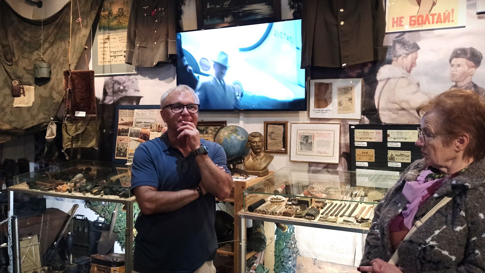 Otrā pasaules kara senlietu ekspozīcijas vadītājs, gids un īpašnieks Valdis Tumovs sarunā ar Preiļu vēstures un lietišķās mākslas muzeja direktori Teklu Bekešu. Foto: A.Jirgensone
