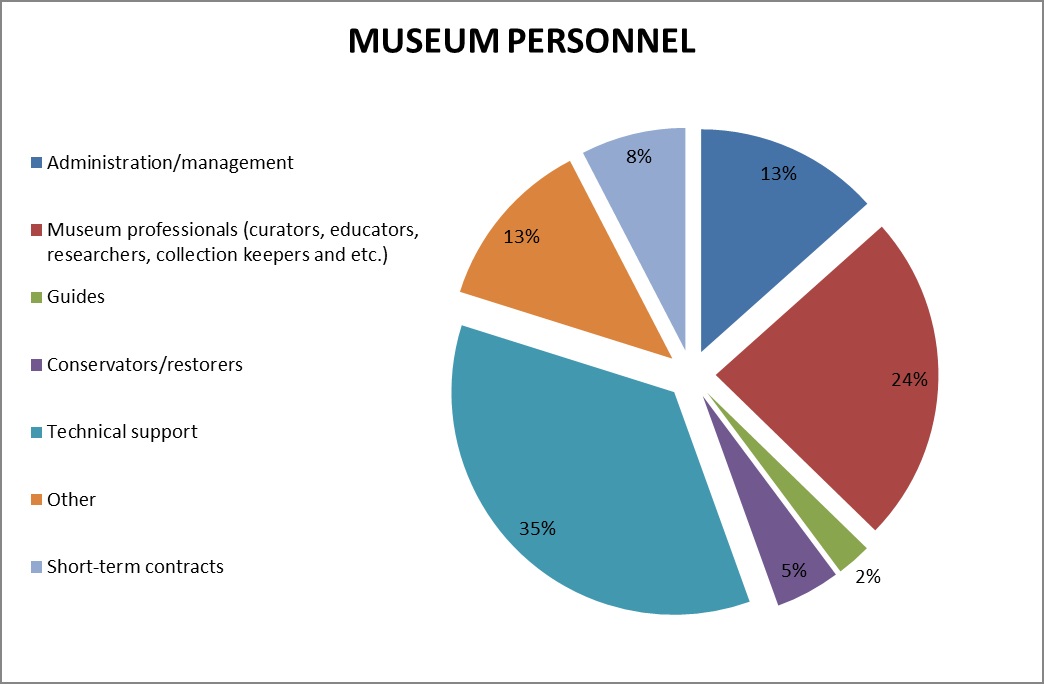 The museum community in Lithuania are people – mostly full-time, some part-time, temporary and even voluntary – who work in museums and aid this social, leisure, learning and economic process. According the national statistics of 2012, the total number people working in the museums was 3055. The largest number of museum staff is from the technical support divisions, but the museum professionals (incl. curators, educators, researchers, collection keepers and etc.) also are quite big and the most important part of the museum staff structure(Pic. No. 1).