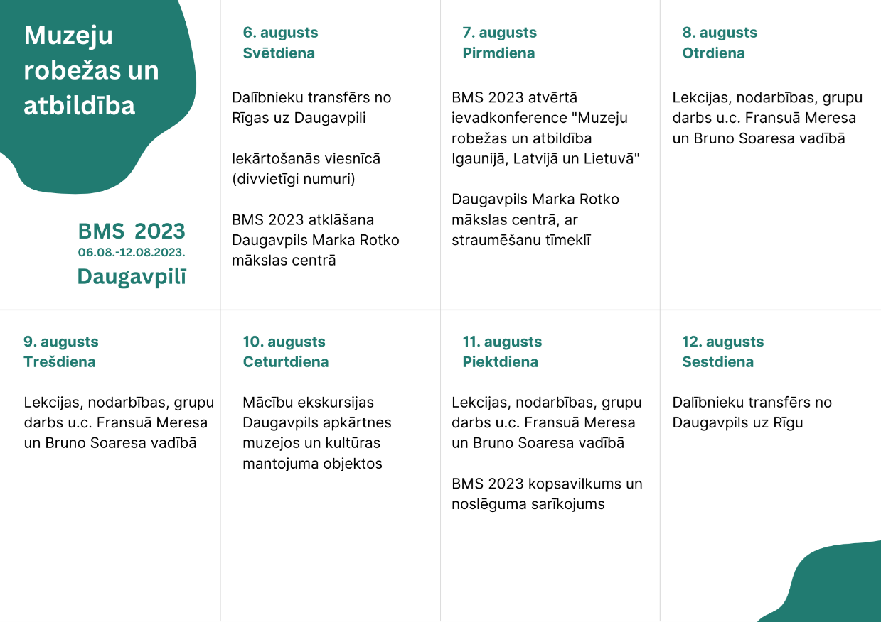 Aicinām muzeju speciālistus un vadītājus pieteikties 19. Baltijas Muzeoloģijas vasaras skolā (BMS-2023), kas notiks no 2023. gada 6. augusta līdz 12. augustam Daugavpilī, Latvijā. Vasaras skolas tēma – "Muzeju robežas un atbildība".
