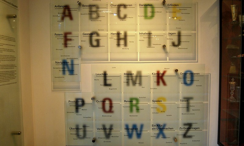 Ar pirmo alfabēta burtu „A” vācu valodā sākas vārds Anfang (latviski – sākums). Un tā, zem šī vārda grupējas dažādas apakštēmas, kas saistītas ar kaut kā jauna uzsākšanu: "atvēršana", "Brēmenes atslēgas", "bērnība", "ienākšana" utt. Tā kā ikvienam priekšmetam blakus ir norādīts numurs, interesents var savā planšetē iegūt informāciju par priekšmetu. Krājums izvietots dažādas konfigurācijas stiklotās vitrīnās un ir ērti aplūkojams.