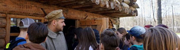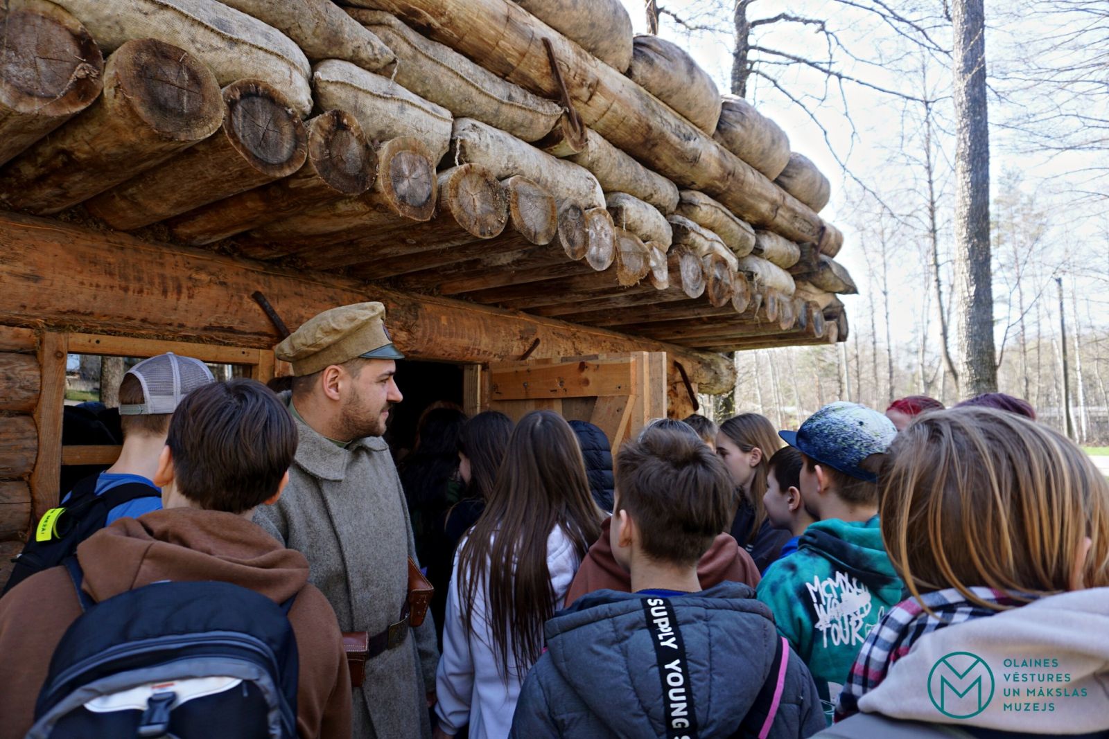 Ilustrācija: Skolēni Olaines Vēstures un mākslas muzeja izveidotajā Pirmā pasaules kara vēstures izziņas maršrutā. Olaines VMM publicitātes attēls.