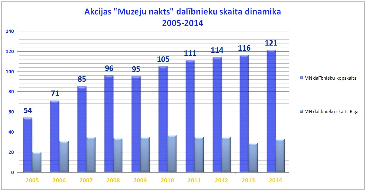1. grafiks rāda, ka līdz pat 2014. gadam Muzeju nakts akcijā piedalījušos muzeju skaits konstanti ir audzis. Ja Rīgas muzeju, akcijas dalībnieku, skaits, sākot ar 2007. gadu, svārstās tikai nedaudz, tad muzeji reģionos izrāda arvien lielāku interesi par dalību Muzeju naktī.